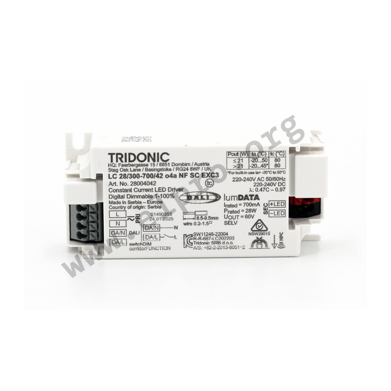 LED power supplies with a Dali-2 push-dimm connection and a output power of 28W. These power supplies for lights in a plastic housing have a programmable and choosable output current, as well as they are suitable for DC application. We offer the type 28004042 of the LC 28W 300–700mA o4a NFC SC EXC series of Tridonic Deutschland.