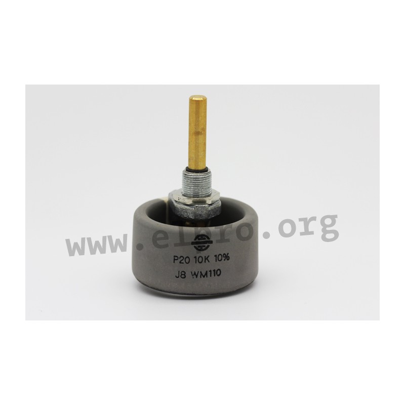 109719 P 20 10 R P20 50 10R 10% AEY P20 50 10R 10% AEY Heavy duty wirewound potentiometers series P20 by Vishay. The potentiometers are marked by a high power rating and cement coating. Furthermore, they possess precious metal rivet wipper and tinned solder tag terminals. We are offering the following types by Vishay: P 20 10 R, P 20 22 R, P 20 47 R, P 20 100 R, P 20 220 R, P 20 470 R, P 20 1 k, P 20 2,2 k, P 20 4,7k and P 20 10 k. • rated dissipation (40°C): 30W• insulation voltage: 2500V / 50Hz• anglestart to stop: 290°over winding: 276°• max. torque: 4Ncm• max. torque at stop, ca.: 100Ncm• torque for mounting:: 200Ncm• weight: 70g