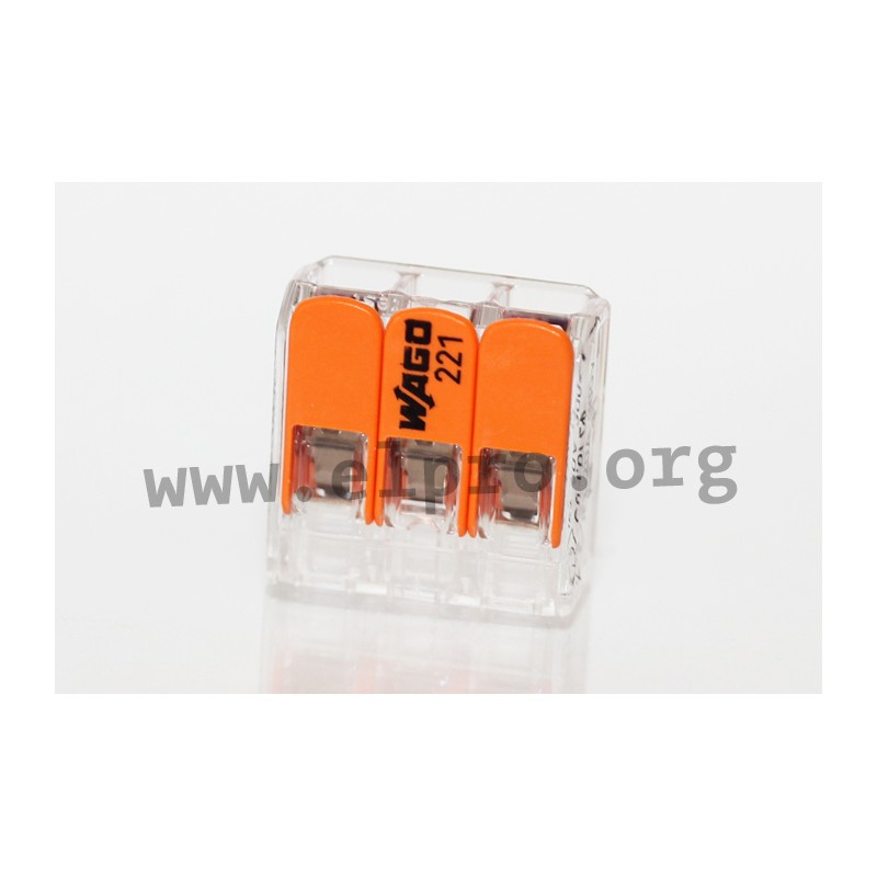 2-, 3- and 5-conductor connectors for all types of conductors with CAGE CLAMP® connection, and push-in operating levers. They have a side wire entry and are suitable for a wire cross section of 0,2 to 6mm2 (solid-core/multi-wired) resp. 0,14 to 6mm2 (fine-stranded). Furthermore, matching mounting adapters with (221-250_/221-251_) or without a strain relief (221-252_/221-253_) are available. We offer various types of this Wago series.