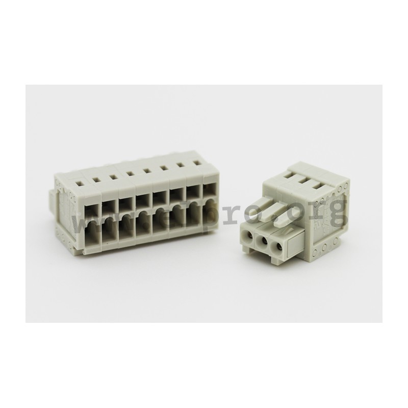 106696 734-102 734-102 Female connectors, MCS-Mini by Wago. Universal connections for all types of conductors with customer side mount strain relief plates and enclosures. They are endued with two operating directions for the CAGE CLAMP® simplify wiring in the cable prefabrication and on devices. The connectors are codable and protected against mismating.• pitch: 3.5mm• connectivity: CAGE CLAMP®• conductor cross section: 0.08 to 1.5mm²• rated voltage: 160V• rated impulse withstand voltage: 2,5kV• rated current: 10A Suitable male headers in straight and angled version.