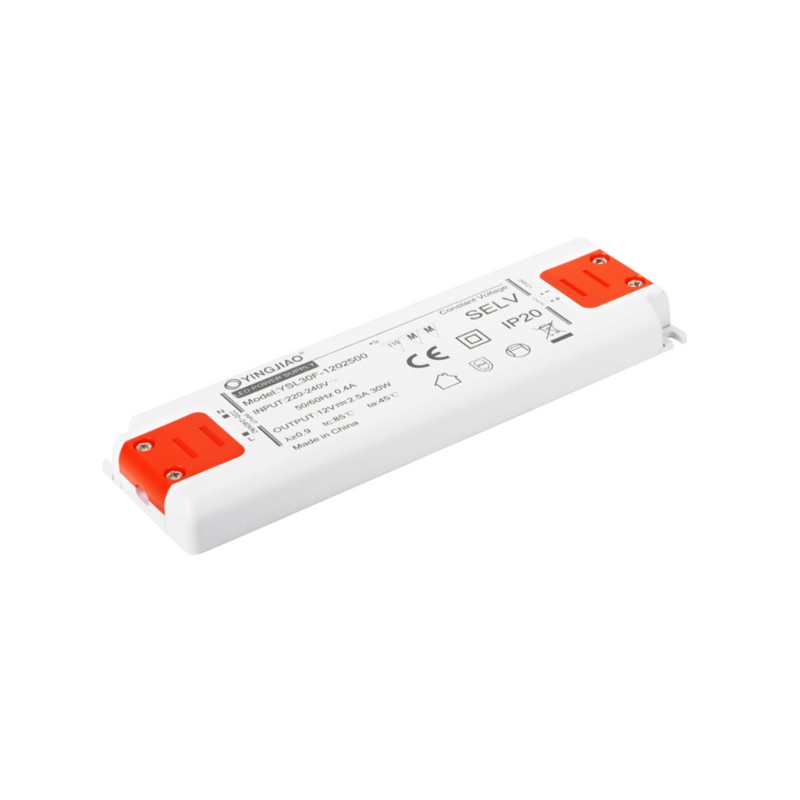 Not dimmable AC/DC LED power supplies for CV operating mode, in a enclosed plastic housing, with 30W and IP20. These devices are flicker free and they are protected against over voltage, over load, as well as short circuit. We offer the following types of this Yingjiao series: YSL30F-1202500 und YSL30F-2401250.