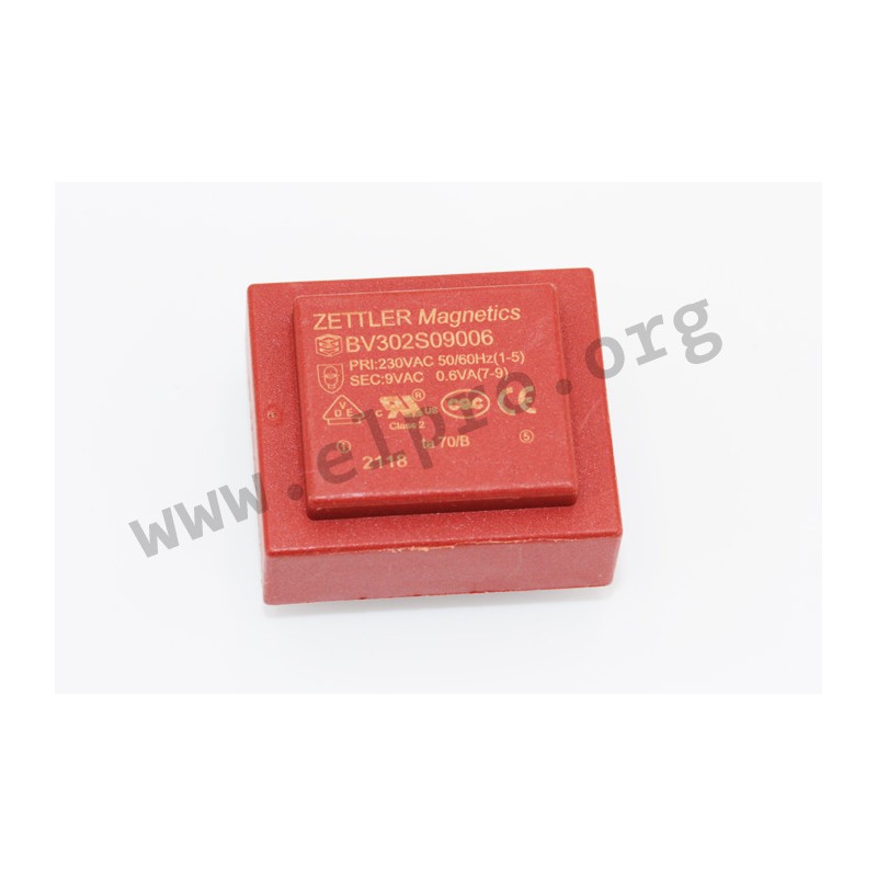 Transformers with an EI30 core and 0,6VA. These devices comply with temperature resistance class Ta 70/B and are short circuit proof. They are suitable for PCB mounting and are rated for an operating temperature of up to +70°C. We offer the following types of this Zettler series: BV302S06006, BV302S09006, BV302S12006, BV302S15006, BV302S18006 and BV302S24006.