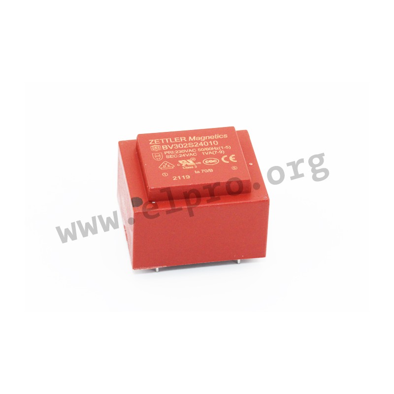 Transformers with an EI30 core and 1VA. These devices are short circuit proof and comply with temperature resistance class Ta 70/B. They are suitable for PCB mounting and are rated for and operating temperature of up to +70°C. We offer the following types of this Zettler series: BV302S06010, BV302S09010, BV302S12010, BV302S15010, BV302S18010 and BV302S24010.