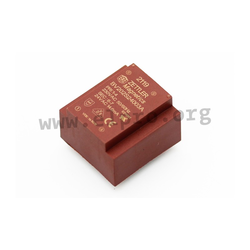 Short circuit proof transformers with 0,35VA and an EE20/6,5 core. These devices are suitable for PCB mounting and comply with temperature resistance class Ta 50/B. They have a dielectric strength of 4,2kV and are suitable for an ambient temperature of up to 50°C. We offer the following types of this Zettler series: BV202S06003A, BV202S09003A, BV202S12003A, BV202S15003A, BV202S18003A and BV202S24003A.